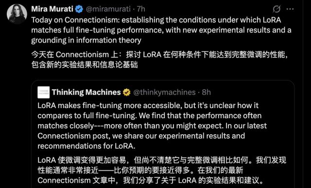 Thingking Machines 创始人、OpenAI 前 CTO Mira Murati 继续转发站台。
