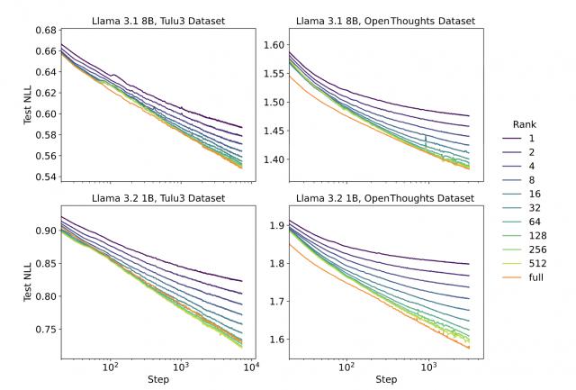 结果显示高秩 LoRA(如秩 512)的学习曲线与 FullFT 几乎完全重合,两者的损失值均随训练步数呈对数线性下降趋势;