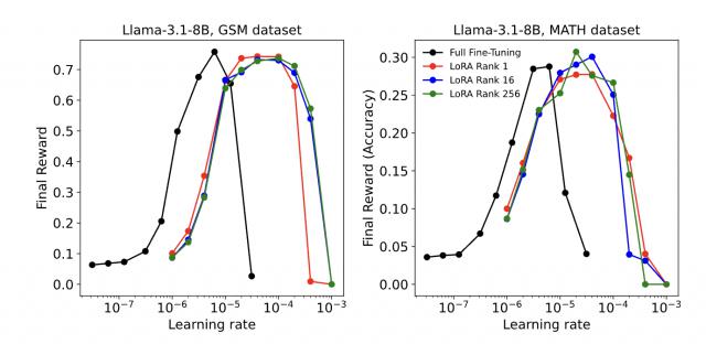 并且,在 MATH、GSM 等数学推理类强化学习任务中,即便将 LoRA 的秩降低至 1,其性能依旧能与 FullFT 持平。