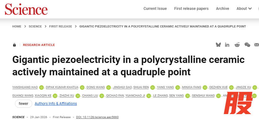 近日,《科学》期刊在线发表了甬江实验室上席研究员、西安交通大学讲座教授任晓兵联合团队的突破性成果:通过将一类经典且低成本的多晶压电陶瓷的核心性能指标提升超过10倍,他们创制出了“超级压电陶瓷”,并开创了主动压电器件新范式,让材料稳定工作在“性能珠峰”。
